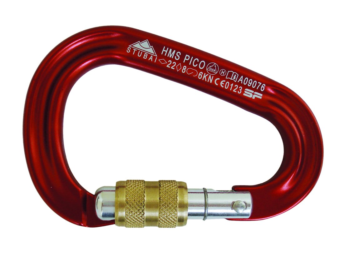 Stubai bringt den neuen HMS-Karabiner PICO. Der kleine, sehr handliche HMS-Winzling zeichnet sich vor allem durch sein geringes Gewicht (58g !) aus. Neben der roten Eloxierung mit einer gewissen Signalwirkung fällt bei diesem Teil auch die große Schnapperöffnung (20 mm) positiv auf. Natürlich hat der Karabiner einen Easylock-Verschluss (=Keylock).
