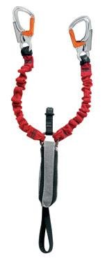 Was man dazu braucht? Zwei neue Schnellverschluss-Karabiner, ein Y-Verbindungsmittel mit Gummizug und eine dritte Kurze Schlinge zur zusätzlichen engen Fixierung am Stahlseil. Der Bandfalldämpfer reißt bei einem Sturz auf und ist durch eine Reißverschlusshülle geschützt.