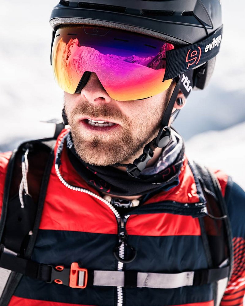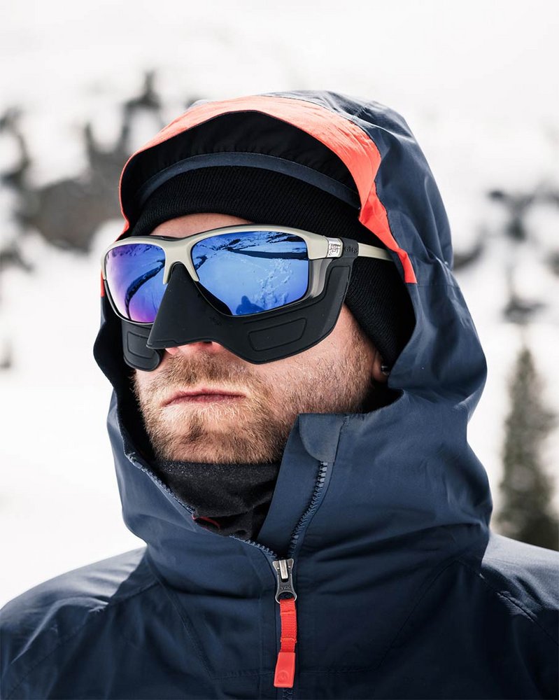 Ergänzend zur bestehenden elate.o pro mit nose cover präsentiert evil eye nun ein völlig neues Add-on für das neueste Modell der elate-Familie: eine Gesichtsmaske aus schwarzem Silikon. Die facemask schützt erstmals die gesamte Nasen- und Wangenpartie vor schädlicher UV-Strahlung, Kälte und Wind, was vor allem bei Bergtouren in hohen Lagen eine beträchtliche Rolle spielt. Sie wird ganz einfach über den Bügel gestülpt und am Nasensteg befestigt und bietet damit vollflächigen Schutz auf Gletschern und in eisigen Höhen.