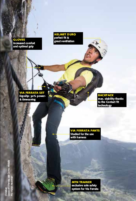 Der Faktor „Sicherheit“ hat in der Via Ferrata Priorität. Eine gewisse Fitness, Eigenverantwortung, Aufmerksamkeit, Erfahrung und vor allem auch die richtige Ausrüstung sind Voraussetzung. Diese Anforderungen muss jeder Bergsportler selbst mitbringen oder erlernen. Die komplette Ausrüstung gibt es von Salewa, der Südtiroler Bergsportspezialist bietet die gesamte Produktpalette für das sichere Abenteuer am Klettersteig. Von der Bekleidung, über die Schuhe bis hin zu Helm und Klettersteigset. Egon Resch, General Manager Technische Hartware der Salewa Gruppe, ist für die Entwicklung und Sicherheit der Produkte zuständig und erklärt: „Wir gehen die Thematik ganzheitlich an, indem wir mit Bergführern, Athleten und Institutionen stark vernetzt zusammenarbeiten. Der Erfahrungsaustausch ist hierbei besonders wertvoll. Zudem setzen wir besonders auf die passive Sicherheit, das bedeutet, dass wir unsere Neuentwicklungen danach auslegen, dass sie nicht nur im Falle eines Sturzes das Schlimmste verhindern, sondern so, dass es möglichst gar nicht erst zum Sturz kommt.“ Diese Prävention durch Vermeidung von Fehlerquellen, ist vor allem für Klettersteiggeher besonders wichtig, da man die Folgen eines Sturzes nicht unterschätzen sollte.