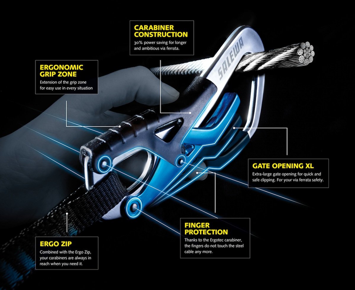 In Kooperation mit der Technischen Universität München hat Salewa den neuen Klettersteigkarabiner ERGOTEC entwickelt. Die 30%ige Kraftersparnis bei der Kraftmessung macht den neuen Karabiner zum perfekten Begleiter im Klettersteig. ERGOTEC ist in jeder Situation kinderleicht ein- und auszuhängen. Die Bedienung erspart dadurch viel Kraftaufwand und ermöglicht ein höchst komfortables und schnelles Einhängen in das Stahlseil. Die neuen Klettersteigsets Ergo Zip sind mit dem ergonomischen Karabiner ausgerüstet und verfügen über einen Bandfalldämpfer und integrierten Zip Roller.