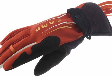 Der Camp G Comp Warm ist ein innovativer Skitourenhandschuh, bei dem der Überhandschuh aus PrimaLoft schnell und kaum sichtbar im Handgelenk des dünnen Unterhandschuhes verstaut wird. Hand- und Karabinerschlaufe verhindern, dass man den Handschuh verliert. Der Handschuh kommt nächsten Winter in sechs Größen und wiegt inkl. Überhandschuh gerade mal 110 g (XL).