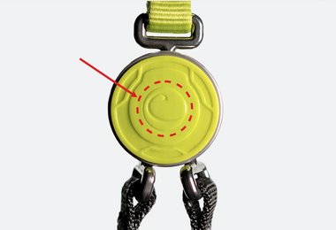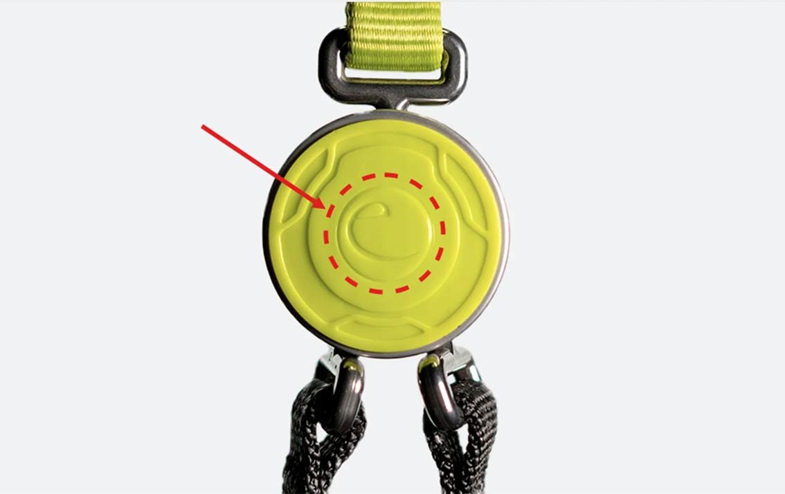 Die Chargennummer ist in der Produktkennzeichnung des Falldämpfers enthalten. Diese befindet sich unter der Klettverschlusslasche der grünen Tasche des Falldämpfers und ist in folgendem Format angegeben, z. B.: Y-2024-0364 …