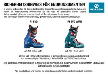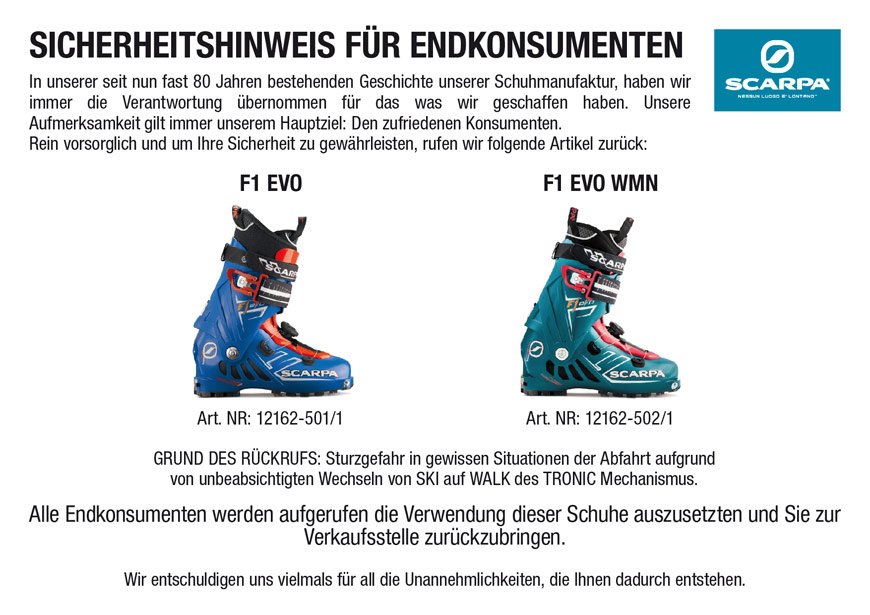 SCARPA ruft ALLE F1 Evo und F1 Evo Women Modelle zurück. Und zwar nicht zur Reparatur, sondern komplett. D.h. die Schuhe sollen bei dem Händler zurückgegeben werden, wo sie gekauft wurden - der Kaufpreis wird erstattet!