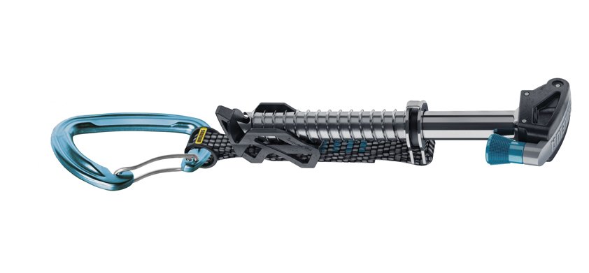Wer kennt das beim Eisklettern nicht, die Eisschrauben hängen am Klettergurt (meist in einem Sammelkarabiner) und stechen beim Auf- oder Abstieg kleine Löcher in die Hose. Salewa bringt eine kluge Lösung für eine Eisschraube mit Expressschlinge und Tragevorrichtung. Die Schrauben hängen alle mit den Spitzen nach oben in einer Schutzvorrichtung, diese lässt sich schnell bei Bedarf lösen, die Schraube ist sofort einsatzbereit.