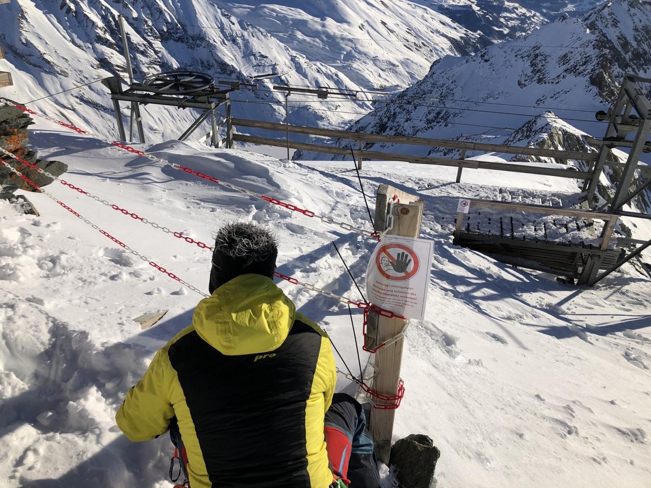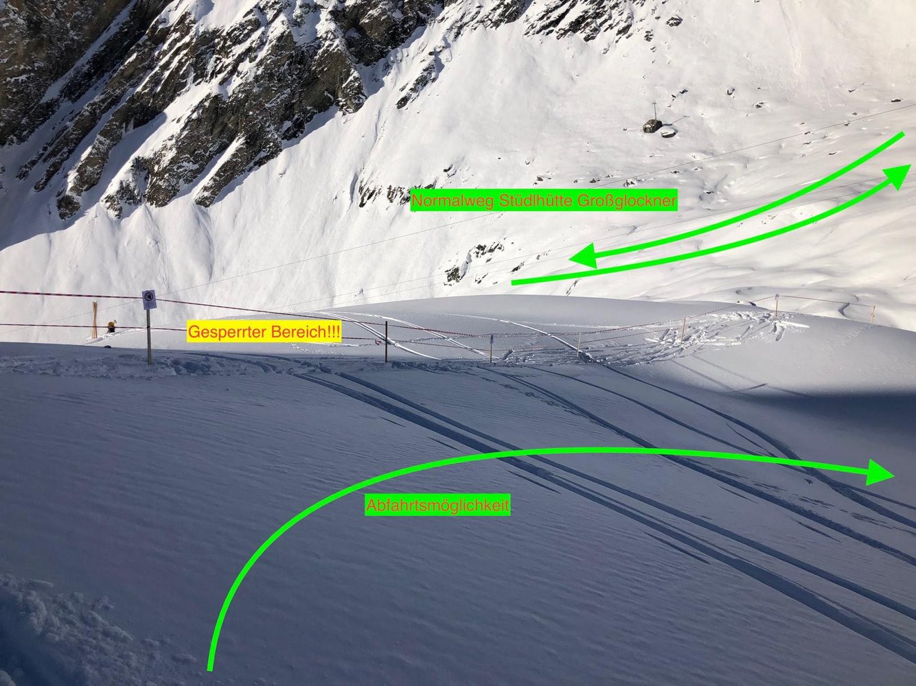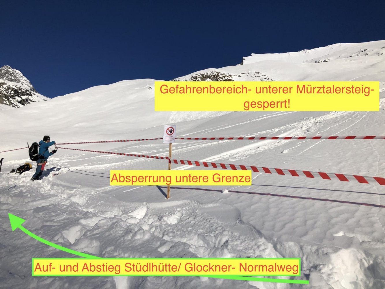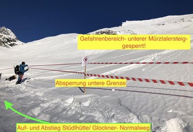 Der Bereich umfasst als untere Grenze die Linie- Abzweiger Stüdlhüttenweg/Mürztalersteig und als obere Grenze den Bereich Johann Stüdlweg (Glorerhütte – Stüdlhütte) bis oberhalb Stütze 4 der Seilbahn. Anbei Bilder des gesperrten Bereichs. Dieser Bereich ist unbedingt zu meiden, es besteht Lebensgefahr durch Seilausschlag! Wir haben den unmittelbaren Gefahrenbereich auch sichtbar abgesperrt. Routeninfos: Grossglockner Normalweg von Süden