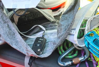 Im Arcteryx Alpha SL 30 gibt es sogar zwei Zipptaschen - eine innen, dort wird bei uns z.B. die Stirnlampe und der Autoschlüssel (für den gibt es ein eigenes Sicherungsband) verstaut. Außen ist noch eine schnell zugängliche Zipptasche, in der wir das Handy und sonst noch ein paar Kleinigkeiten (Pickelschutz etc.) aufbewahren. Die beiden Taschen sind gut gelungen und ausreichend groß, bei anderen ultraleicht Rucksäcken sucht man diese Art von Zipp-Taschen meist vergebens bzw. muss man meist nur mit einer Tasche vorliebnehmen.