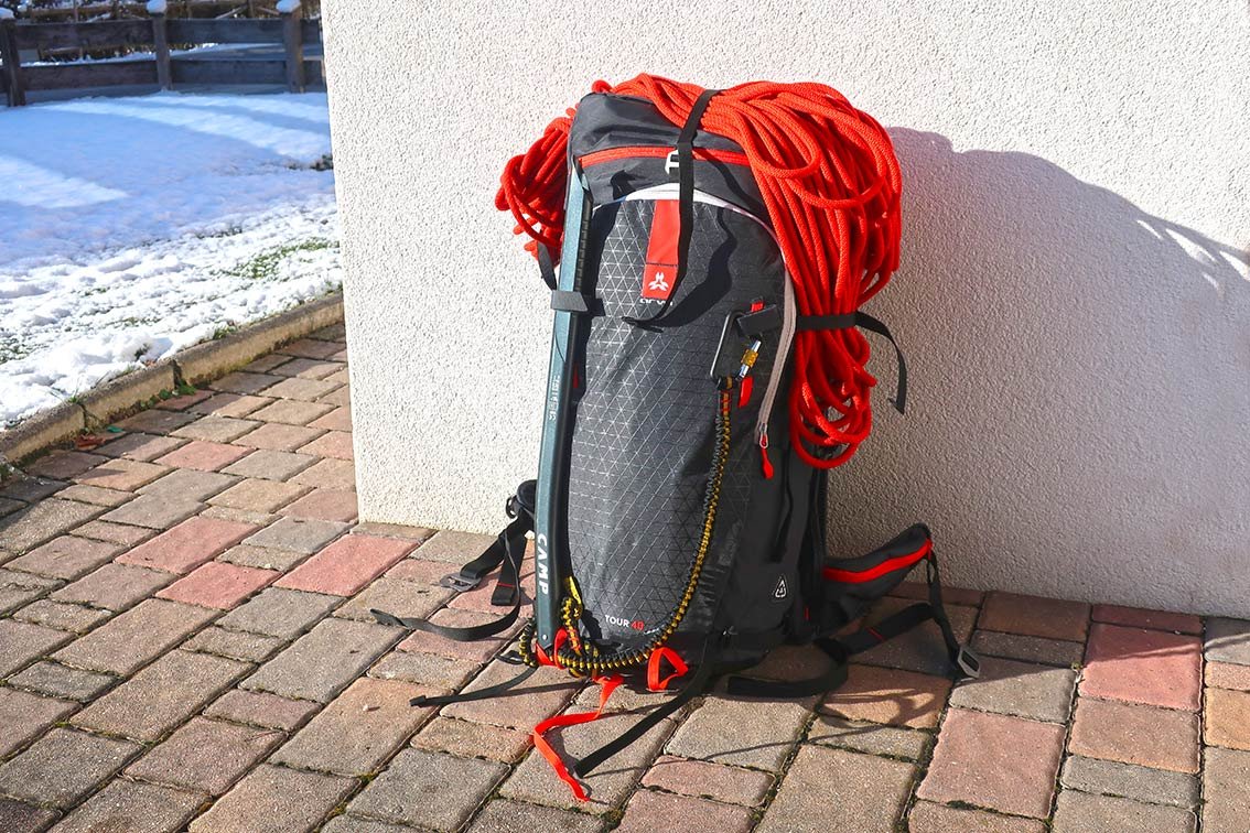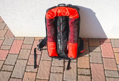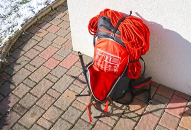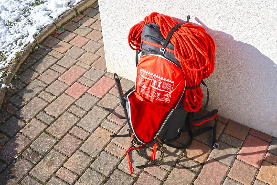 Die große 40 Plus Hülle spielt dann noch etwas mehr Stückchen als der 25 Liter Sack. Alles ist größer, oben gibt es einen Rollverschluss und ein zusätzliches Verschlussband, mit dem man z.B. auch das Seil auf dem Rucksack fixieren kann. Neben der großen Innentasche gibt es auch außen ein Sicherheitsfach - beim großen Rucksack nutzt man besser die Innentasche für die Ladung (dank Rolltop sehr gut zu handeln) und die Sicherheitsausrüstung kommt außen hinein. An der Seite gibt es außen noch 2 zusätzliche Netzfächer, man bekommt in den 40 Plus also sehr viel hinein!
