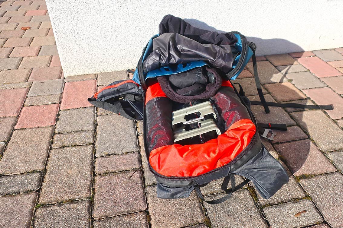 Ganz oben gibt es noch ein drittes Fach – groß genug für Skibrille und/oder andere Utensilien, die man auf der Tour in der Rucksack-Deckeltasche mitführt. Stauraum ist also genügend vorhanden und sehr positiv: Der Rucksack macht für ein 25-Liter-Modell eher einen großen Eindruck (oft ist das Gegenteil der Fall)!