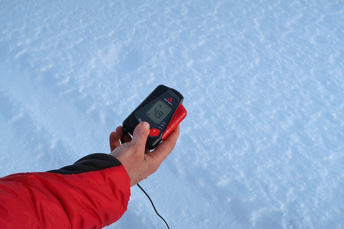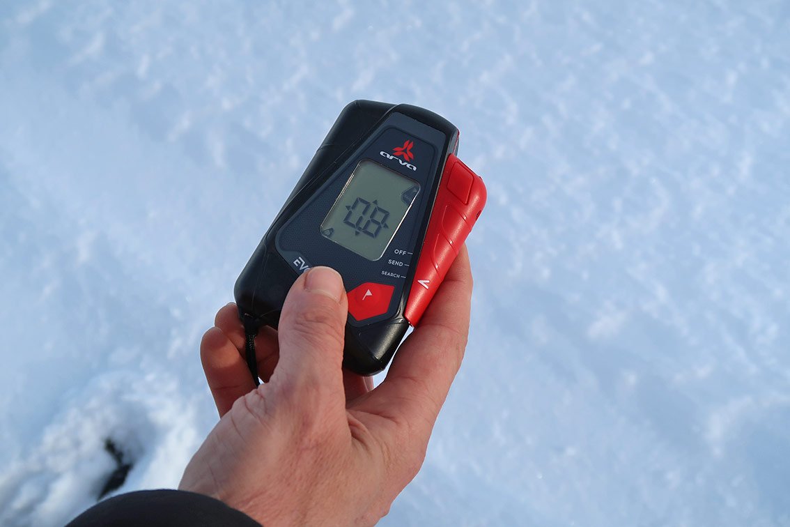Der Bildschirm des Arva Evo 5 ist natürlich kein 75“ Smart-TV, er zeigt aber wirklich gut und präzise, in welche Richtung man sich bei der Suche bewegen muss. Die Anzeige ist klar und leicht verständlich – man kommt auch ohne große Einschulung recht schnell mit diesem sich fast selbst erklärenden Mini-LVS-Gerät zurecht. Beim „OFF“ (Ausschalten) muss man den Vorgang mit der Markierungstaste abschließen – ein sinnvoller Schutzmechanismus.