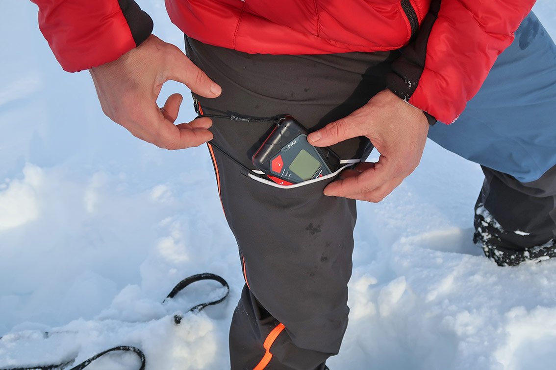 170 Gramm und wirklich sehr kompakt (70 mm breit und 110 mm hoch) – so passt dieses kleine LVS auch gut in jede Hosentasche. Eine mitgelieferte Befestigung mit kleinem Karabiner sorgt für die sichere Fixierung. Wir tragen das Arva Evo 5 eigentlich immer in der Tasche mit, weil dieses LVS-Gerät so klein ist, stört es beim Gehen überhaupt nicht.
