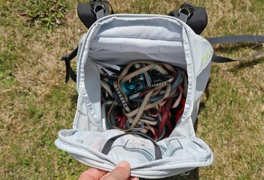 Mit dem Gewicht sind wir auch schon beim wichtigsten Thema angelangt. Superlight heißt in dem Fall 0,58 kg, was sich durchaus tragen lassen kann. Verzichtet man auf die zusätzliche Schaumstoffeinlage, so kann man den Ascent Superlight sogar auf 0,50 g abspecken. Zusammen mit den 30 Litern Volumen ein sehr guter Wert. Beim Volumen fällt positiv auf, dass man fast alles sehr gut in den Rucksack hinein bekommt - das Seil kann man aber auch sehr gut an den Schulterträgern außen festzurren.
