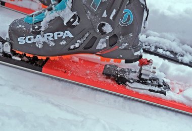 Beim Abfahren rastet der Schuh hinten wie gewohnt in den Aufnahmebügel ein, vorne wird die Bindung beim Abfahren (wie bei anderen Pinbindungen auch) nicht verriegelt. Die Bindung hat einen „Skiflexausgleich“ in Form einer Feder integriert, trotzdem muss beim Montieren oder Verstellen der Abstand zwischen Tourenskischuh und Hinterbacken 4 mm betragen (kleines Plastikteil, mit dem man diesen Abstand misst liegt bei).