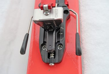Hinten ist noch formschön der Skistopper integriert, er scheint mit der Bindung direkt verbunden sein (für diejenigen, die auf Fangriemen schwören; es gibt die ATK Haute Route 2.0, diese Bindung ist fast baugleich mit der Crest aber eben ohne Skistopper, dafür mit Fangriemen aber ohne die 20 mm Längsverstellmöglichkeit). Der Stopper wird durch einen roten Alustift gelöst oder fixiert – und nur hier kann man evtl. ganz kleine Kritik an der Crest anbringen. Die Bedienung mit dem dünnen Alustift ist etwas gewöhnungsbedürftig.