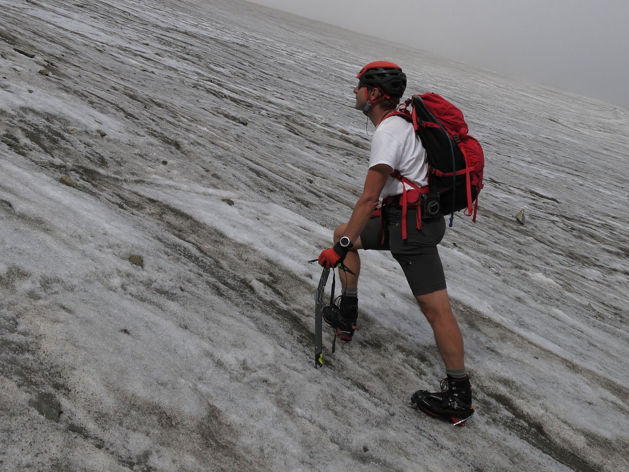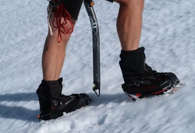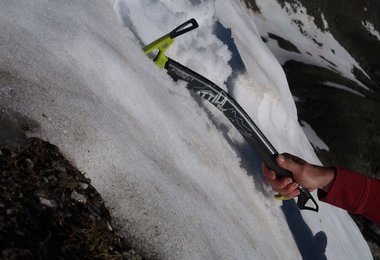 Unser Testmodell wurde mit einer Rolle Grip Tape, aber ohne Handschlaufe und Schutzkappen geliefert. Die Handschlaufe ist als Zubehör erhältlich und wurde umgehend nachgeliefert. Wir haben den Attila Tec im Hochsommer bei klassischen Hochtouren im Einsatz, aber auch bei frühsommerlichen Klettersteigtouren mit steilen Schneefeldern beim Zu- und Abstieg. Der Pickel liegt gut in der Hand und hat ein angenehmes Gewicht (Herstellerangabe: 550 g ohne Handschlaufe; nachgewogen: 606 g inkl. Handschlaufe). Wer wie der Autor unter schlecht durchbluteten Händen leidet, wird sich über den Kunststoffgriff bei der Haue freuen, der bei der normalen Anwendung als Gehpickel etwas gegen kalte Hände hilft, da die Kälte nicht zum Handschuh weiterleitet wird. Wer den Attila Tec hauptsächlich im Steileis einsetzen will, sollte sich den als Zubehör erhältlichen Accelerator bestellen, um die Schwungmasse und damit die Schlagkraft zu erhöhen.
