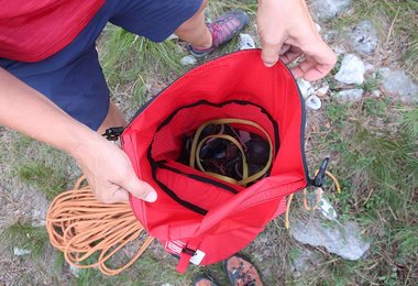 Der Rucksack ist mit 32 Litern eigentlich im alpinen Mittelbereich angesiedelt, durch den Rollverschluss, welcher zusätzlich noch mit einer dreieckigen Deckeltasche überdeckt wird, ist man aber noch etwas flexibler beim Volumen - es geht mehr als die genannten 32 Liter hinein. Ein großes, dreieckiges Fach in der Deckeltasche und die Möglichkeit im Bereich der Rückenauflage etwas zu verstauen, mehr kleine Fächer gibt es nicht.