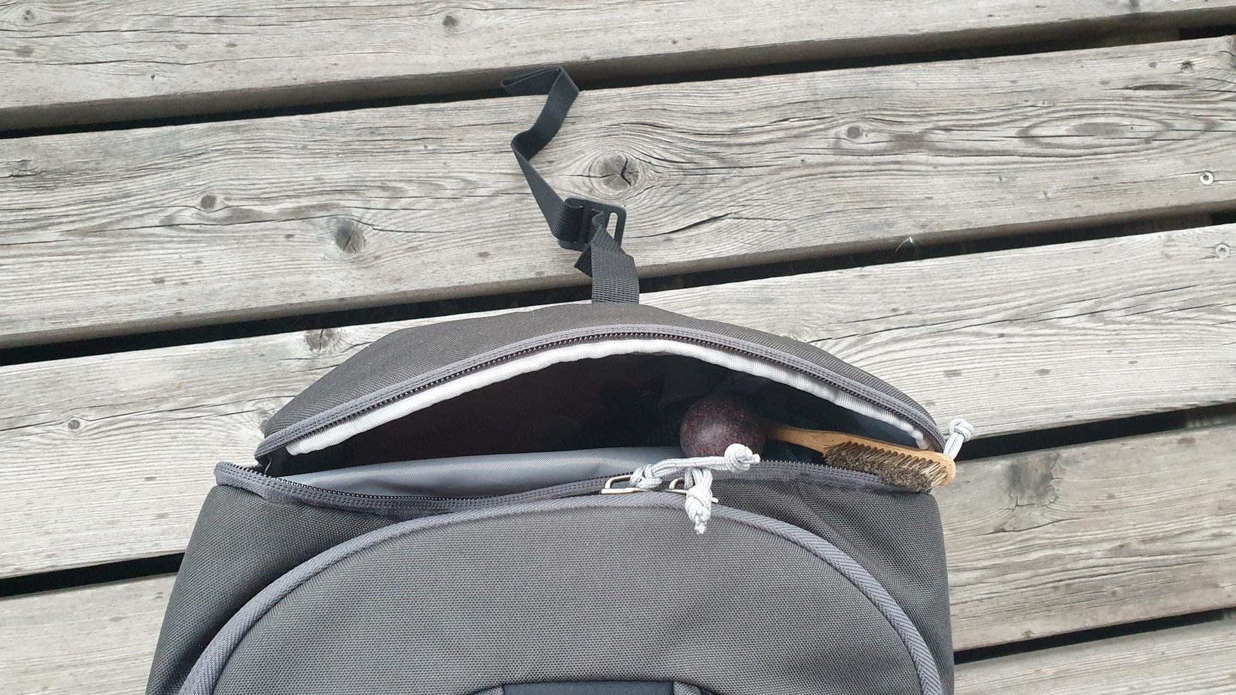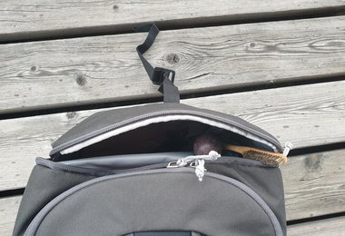Quergriff am Deckel, um den stehenden Rucksack, schnell mal in der Halle zur Seite zu heben.