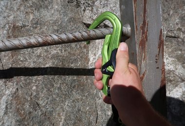 Die Karabiner des Cable Comfort 5.0 liegen hervorragend in der Hand und lassen sich ausgesprochen bequem bedienen. Das Öffnen und Schließen der Karabiner geht fast von alleine, auch bei den Seilankern bleiben die Karabiner wegen ihrer großen Öffnung und Form fast nie hängen. Die Karabiner haben mit 35 mm eine sehr große Öffnung, sodass die Karabiner auch auf sehr dicken Stahlseilen problemlos eingehängt werden können. Durch das hervorragende Konstruktionsprinzip der Karabiner wird das Einklemmen der Finger zwischen Stahlseil und Karabiner geschickt verhindert.