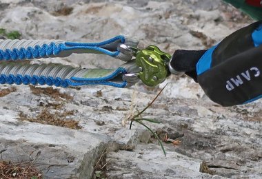 Kommen wir zum Karabiner des Gyro Rewind Pro Klettersteigsets – hierfür hat Camp einen modernen Klettersteigkarabiner mit Handballen-Verschluss entwickelt. Der Horai – so wird der Karabiner bezeichnet – ist formschön, funktionell und liegt gut in der Hand. Die Handballenautomatik ist aus Plastik, das einen guten, stabilen Eindruck macht und sich gut in der Hand anfühlt. Der Öffnungsmechanismus lässt sich schnell und präzise bedienen, auch die große Öffnung trägt dazu bei, dass sich der Karabiner schnell und präzise umhängen lässt.