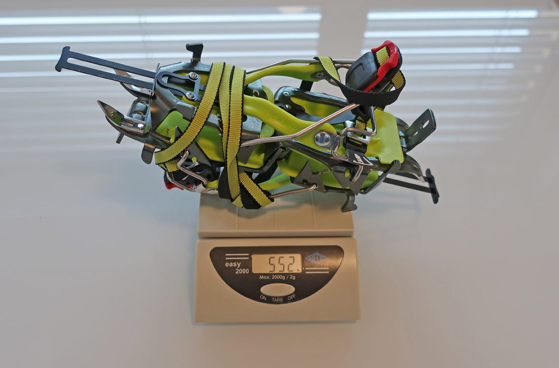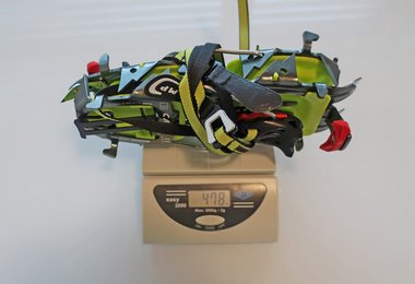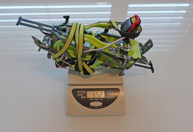 Natürlich haben wir die Steigeisen auf die Waage gelegt, das Skimo Nanotech wieg mit T-Stop Fixierungssystem 478 Gramm und in Körbchen-Ausführung 552 Gramm. Durch die Nanotech-Frontzacken ist es ja quasi ein Stahlsteigeisen, daher ist dieses Gewicht sicher ein Spitzenwert. Der Unterschied zwischen Stahlspitzen- (Nanotech) und Aluversion (Tour) beträgt 20 Gramm. Wer beim Gewicht noch weiter reduzieren will, kann den Metall-Mittelschlitten durch ein Dyneema-Band ersetzen, das Setting dauert aber etwas (Dyneema-Band ist optional erhältlich).
