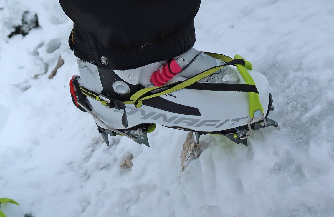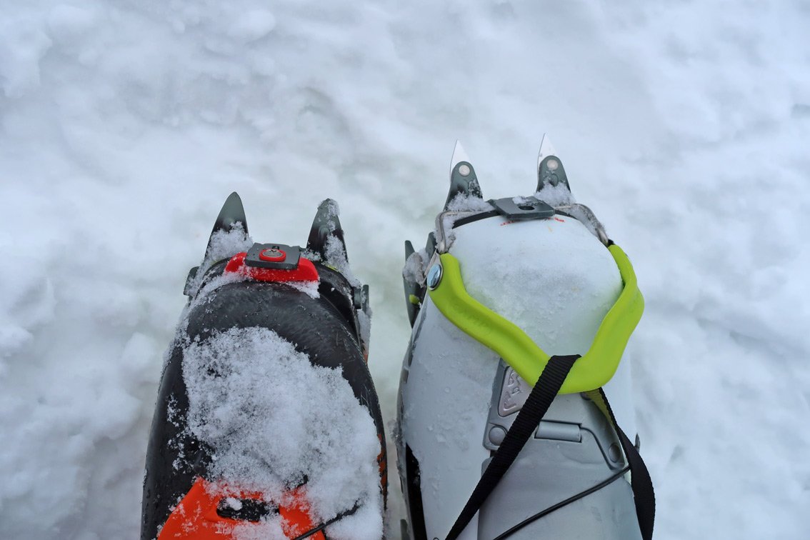 Wir waren echt erstaunt, wie gut sich sowohl die Version mit dem neuen T-Stop Fixierungssystem (das rote kleine Plastikteil, das bei der Skischuhkante vorne wie eine Skibindung einrastet) als auch die Körbchenversion (es gibt ja auch Skischuhe, die vorne keine Bügelaufnahme haben, z.B. einige Modelle von Dynafit) anziehen ließen. Sicher, wir machen das mit Steigeisen nicht zum ersten Mal, aber meist ist bei neuen Modellen am Anfang der Wurm drinnen, das war aber beim Camp Skimo Steigeisen definitiv nicht so.