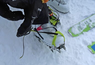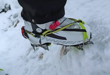 Überrascht hat uns vor allem die Körbchen-Version des Skimo Steigeisen - in unserem Fall ein Skimo Nanotech, aber wir haben auch für die Aluversion gleich ein grünes Körbchen mitgeordert, da wir diese Steigeisen beim Bergsteigen in der Übergangszeit mit unseren leichten Bergschuhen nützen wollen. Man steht wirklich super solide im Steigeisen, da wackelt nichts und man hat immer ein gutes Gefühl. Wir haben es natürlich auch gleich mit unseren leichten Wanderschuhen ausprobiert – das gleiche gute Gehfeeling.