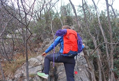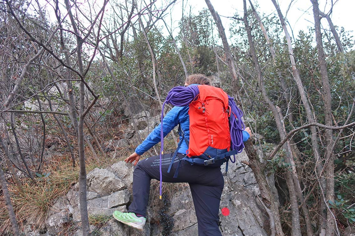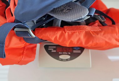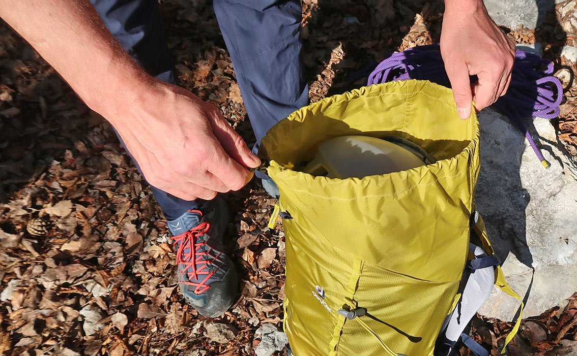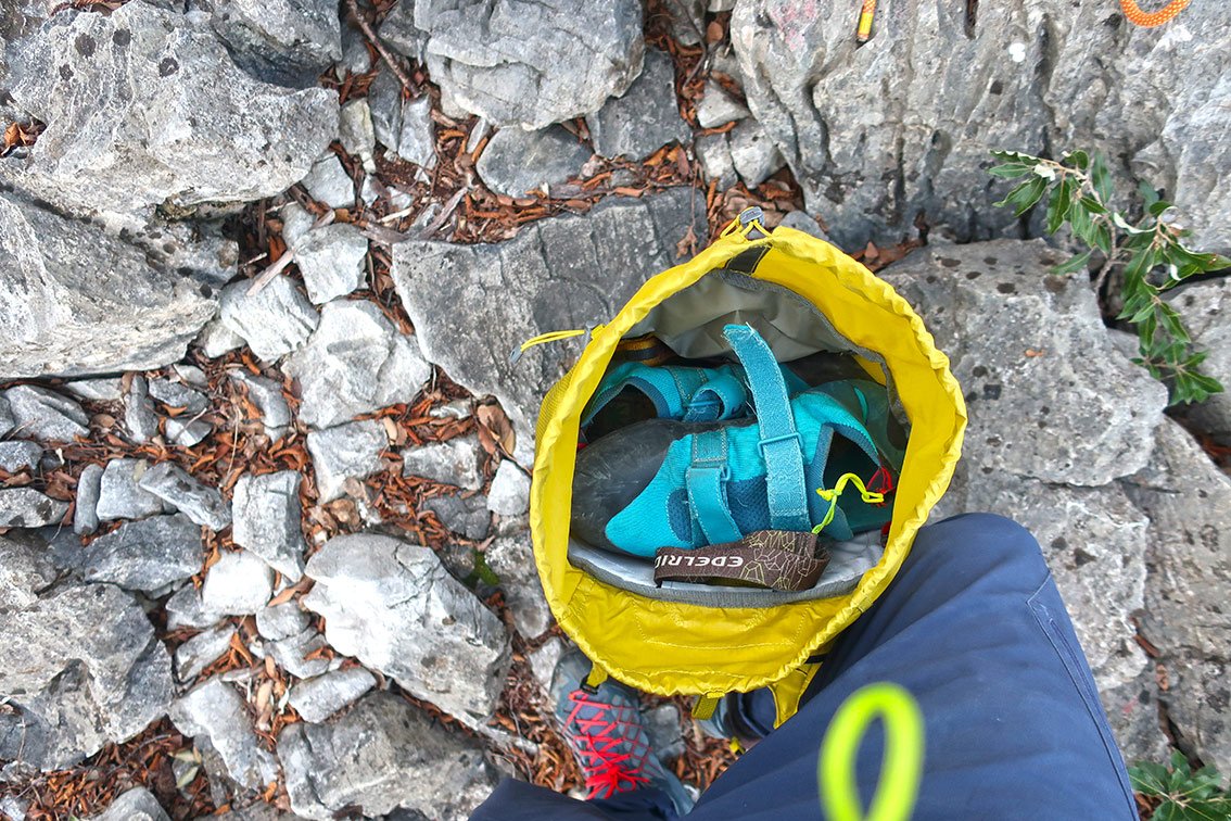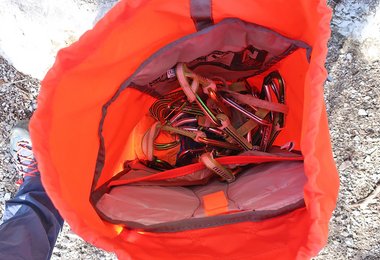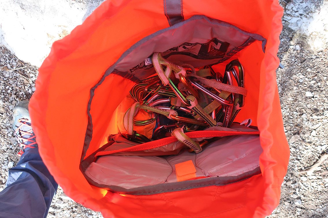Sehr gut gelöst ist die Seilbefestigung – ein dünner Riemen spannt das Seil oben fest auf den Rucksack. Mit der „Lochabdeckung“ - das ist quasi ein Deckelteil, welches den Rucksack oben schließt – kann das Kletterseil noch zusätzlich fixiert werden. Positiv aufgefallen ist uns das beim Zu- und Abstieg, da wackelt beim Seil nix hin und her bzw. es rutscht nicht vom Rucksack, wie das bei Rucksäcken mit schlechter Seilfixierung der Fall ist.