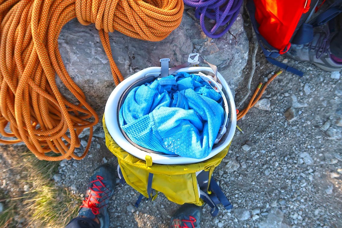 Das Seil kann entweder nur mit dem blauen Zurrband befestigt werden oder eben noch zusätzlich mit dem Deckelteil fixiert werden. Der Helm hat bei unseren Ausflügen (Mehrseillängentouren an der Martinswand und in den Gardaseebergen bzw. Klettersteiggehen in Venetien) immer im Rucksack Platz gefunden. Es gibt aber auch ein extra Helmnetz, um den Helm außen am Rucksack zu befestigen (ist aber nicht im Lieferumfang dabei – es ist uns bis dato aber auch noch nicht abgegangen).