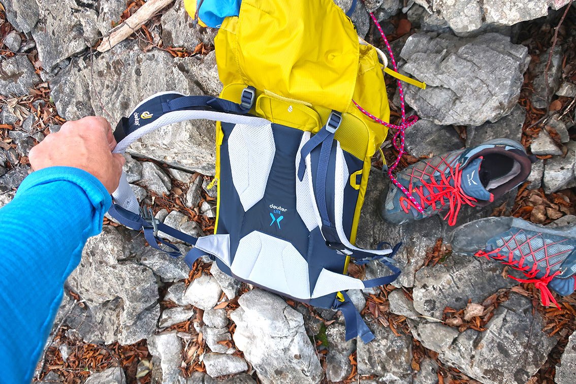 Unsere beiden „Kleinmodelle“ fühlen sich aber primär beim Klettern wohl. Ein gutes Gefühl hat man bei diesen Deuterrucksäcken vor allem, wenn man sie auf dem Rücken trägt. Da macht sich der solide, gut ausgeführte und vor allem etwas gepolsterte Rückenteil bemerkbar. Man geht gerne mit dem Guide Lite und es drückt weder etwas auf der Schulter, noch sticht Ausrüstung (Friends, Karabiner etc.) vom Inneren in den Rücken. Es klingt zwar etwas geschwollen, aber am Rückenteil sieht man die Erfahrung, die Deuter im Rucksackbau eben hat.