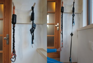 Der Bandfalldämpfer, der die Sturzenergie reduziert, ist schön durch eine Hülle geschützt. Es gibt sogar eine eigene Schlaufe für einen Zusatzkarabiner (Kurzfixierung). Wir bevorzugen aber eine extra Kurzfixierung, derzeit haben wir den Petzl Connect Adjust im Einsatz, da sich mit diesem Teil die Länge (Abstand vom Stahlseil) optimal verstellen lässt. Die Einbindeschlaufe beim Ergo-Zip wurde auch schön groß ausgeführt, das Einbinden in den Gurt funktioniert problemlos.