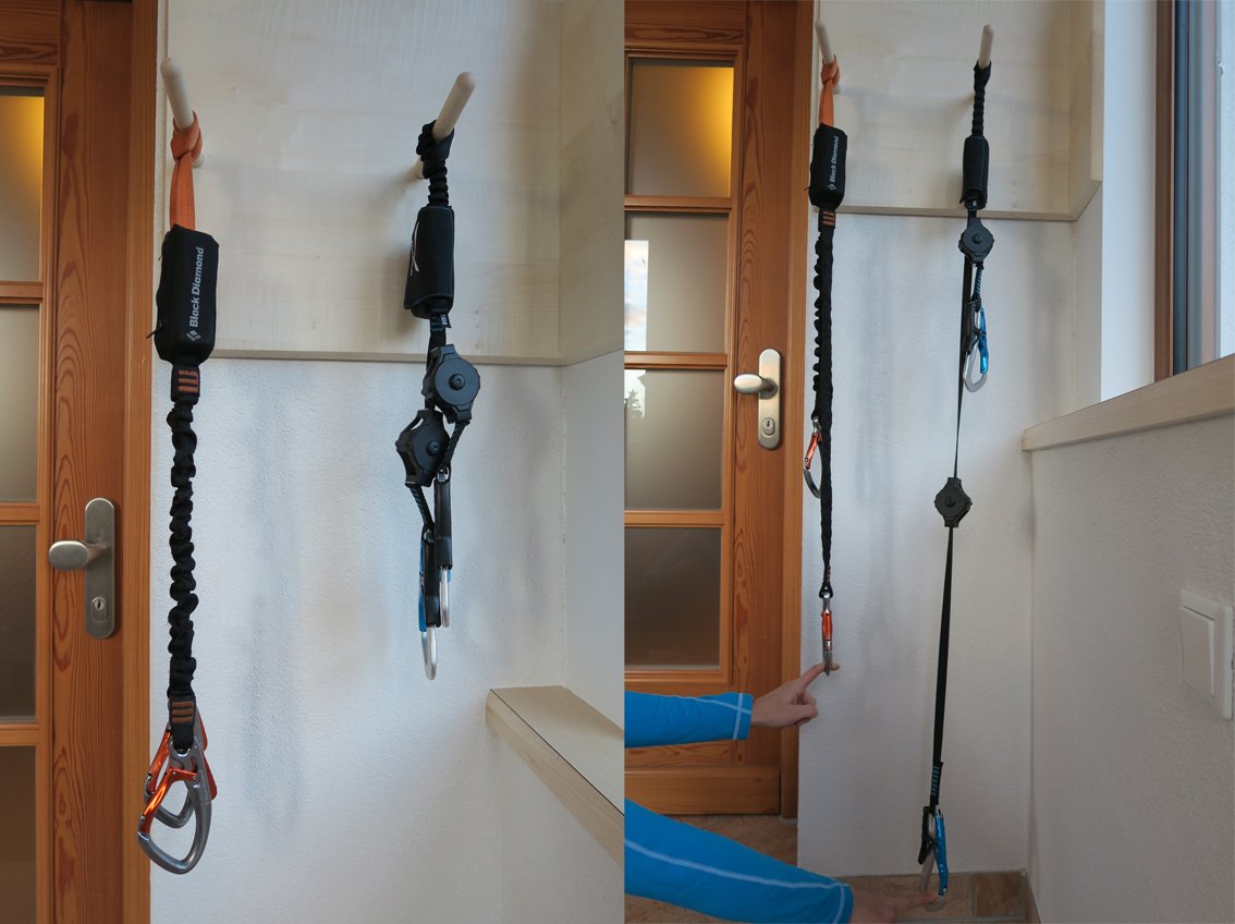 Der große – vermutlich sogar einzigartige – Vorteil der Zip-Konstruktion liegt darin, dass sich die Karabiner quasi automatisch mit nach oben ziehen. Das ganze funktioniert wirklich sehr gut und man spart einiges an Kraft, weil man einfach nicht mehr so tief nach den Karabinern greifen muss (siehe Vergleichsbild mit marktüblichen Gummizug-Klettersteigset). Was für ein Zug auf dem Zip-System ist, merkt man z.B. wenn die Karabiner mal an einem Anker hängen bleiben. Wenn man diese dann löst, schnalzen sie recht schnell nach oben. Ob es jetzt wirklich die 30% Kraftersparnis sind, die von Salewa in der Werbung kommuniziert werden, können wir natürlich nicht feststellen, Fakt ist aber, dass wir uns mit dem Ergo-Zip-Klettersteigset deutlich leichter tun! Noch dazu hat das Ergo-Zip-Klettersteigset um einiges mehr Reichweite (Vorteil beim Umhängen) als herkömmliche Klettersteigsets (siehe Bild).