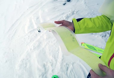 Die Montage auf dem Ski ist einfach, auch beim Abfellen braucht man nur einen kurzen Plastikstreifen, die verbleibende Felllänge klebt dann auf den Schuppen. Der Kleber ist sehr stark, man muss aufpassen, dass nicht Kleber auf Kleber kommt. Falsch zusammengelegte Felle (Kleber auf Kleber) lassen sich nur sehr schwer, evtl. aber auch gar nicht mehr auseinanderziehen.