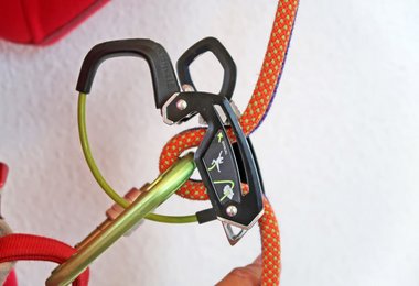 Das Nachsichern des Kletterpartners bei alpinen Mehrseillängentouren im Tuber-Modus geht mit dem Giga Jul aber wirklich top, eigentlich sogar besser als mit unseren geliebten, aber leider in die Jahre gekommenen Tre Sirius. Man muss halt immer auf den Verstellschlitten achten, dass dieser auf Tuber-Modus gestellt ist, dann legt man das Seil und den zweiten Karabiner ein. Nachsichern macht mit dem Giga Jul wirklich Spaß und ist eine relativ entspannte Sache.
