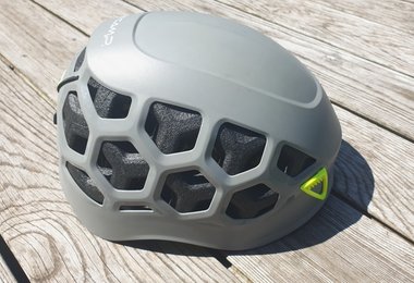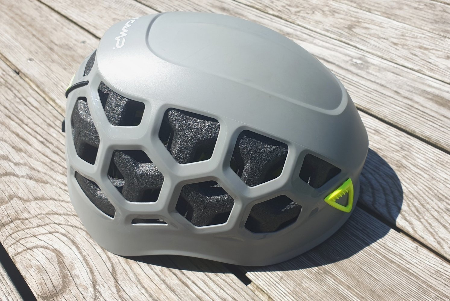 Der Camp Ikon-Helm ist in einer speziellen Hybridbauweise ausgeführt, welche die Robustheit klassischer Hartschalenhelme mit dem Komfort und der Schutzwirkung moderner In-Mold-Technologie verbindet. An den Seiten und hinten hat er 18 Belüftungsöffnungen. Dort und an den Kanten des Helms ist die darüberliegende ABS Außenschale zusätzlich geformt, um den Camp Ikon Helm noch steifer und stabiler zu machen. Die Verbindung von Außen- und Innenschale ist beim Camp Ikon Helm auch ein richtig guter optischer Hingucker, die wabenförmige Struktur hebt sich von anderen Kletterhelmen schön ab.