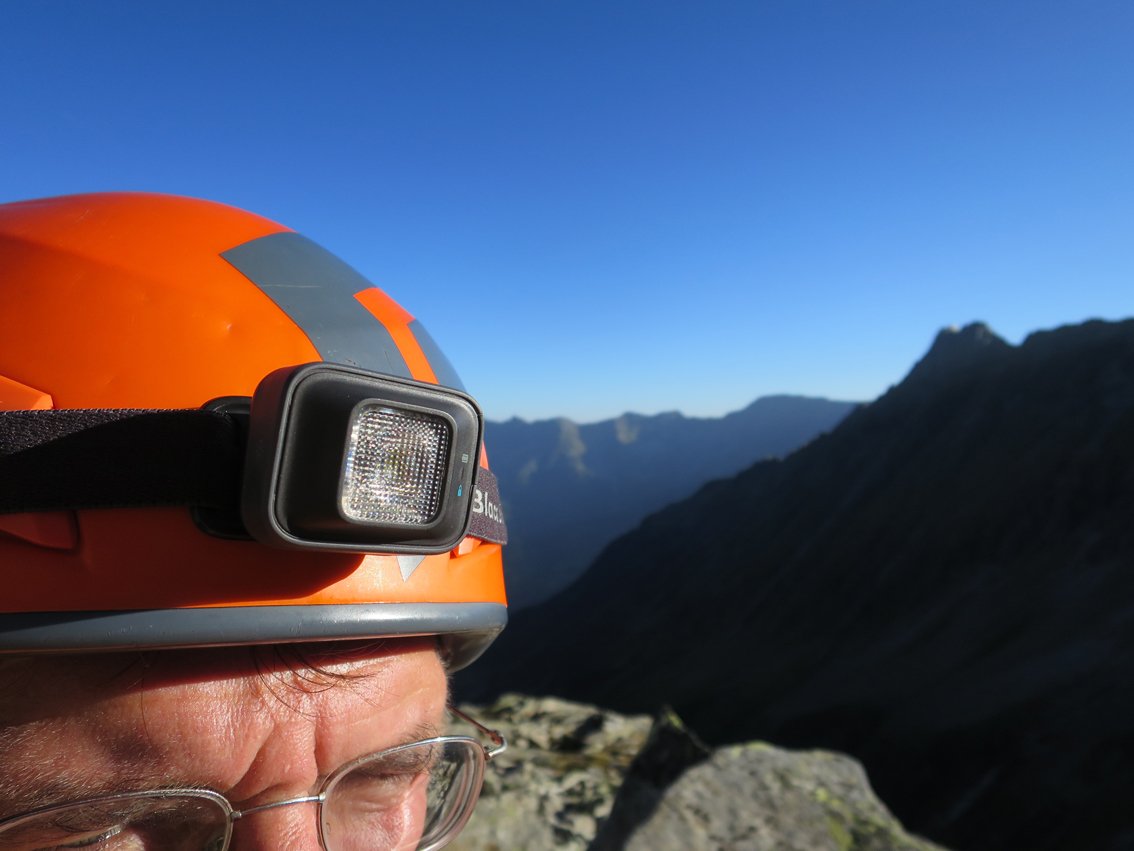 Das Handling der Iota ist denkbar bzw. so einfach, dass wir mit unserem Sample auch ohne Gebrauchsanleitung (Anm.: Ausgeliefert wird die Iota natürlich mit Gebrauchsanweisung:-) zurechtgekommen sind. Den Sperrmodus durch langes Drücken der einzigen Taste überwinden und es wird nach einem kurzen Hallo-Aufflackern gleich fast taghell. Bleibt man auf der Taste, wird das Licht stufenlos gedimmt und dann wieder heller. Bei der Wusch-Helligkeit läßt man die Taste einfach los und auf geht's, denn wir sind ja schließlich zum abendlichen Sport ausgerückt. Für Zu- und Abstiege ist die niedrigste Dimmstufe völlig ausreichend. Braucht man es dann bei Wegweiseren, oder beim Kartenstudium kurz doch etwas Heller, verwendet man durch Berühren an der rechten Seite die PowerTap-Technologie und die Iota gibt gleich wieder Vollgas. Eine weitere Berührung schaltet wieder in den vorher ausgewählten Dimmzustand zurück - in den 56 g steckt doch ganz schön viel Hirnschmalz. Dass sich am Kopf oder Helm auch die Neigung verstellen lässt, ist wohl eh klar.