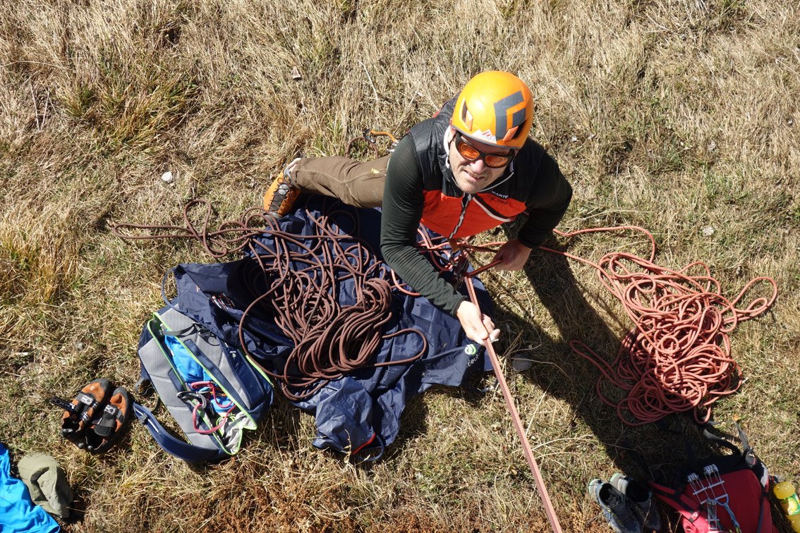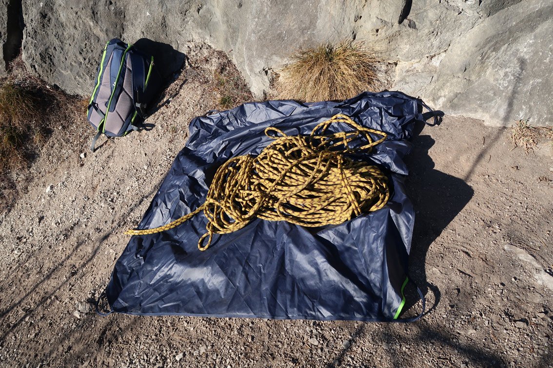 Schon beim ersten Auspacken zeigt sich die Zweiteilung von Rucksack (Motion Rucksack) und Seilplane (Rope Sheet) als goldrichtig, liegt doch der Rucksack immer sauber am selben Fleck und nur das Rope Sheet muss uns durch den Dreck von einer Einseillängenkletterei zur nächsten folgen. Ist der Weg mal etwas weiter, lässt sich das Sheet ideal mit den Schlaufen etwas komprimieren und das Seil kommt – ähnlich wie bei einem Schlangensack – nicht mehr heraus.