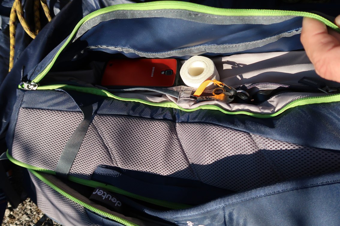 Nachdem wir unsere Touren erledigt haben, verstaut man sein gesamtes Material wieder im Motion Rucksack. Links und rechts vom großen „Hauptfach“ gibt es noch je ein längliches Fach, in welchem Autoschlüssel, Geldbeutel, Tape etc. getrennt von den Klettersachen verstaut werden können. Ein wirkliches Highlight ist aber die Anordnung des großen Reißverschlusses, der vertikal über das gepolsterte Rückenteil verläuft – so liegt die beim Tragen am Rücken liegende Polsterfläche nie im Dreck!