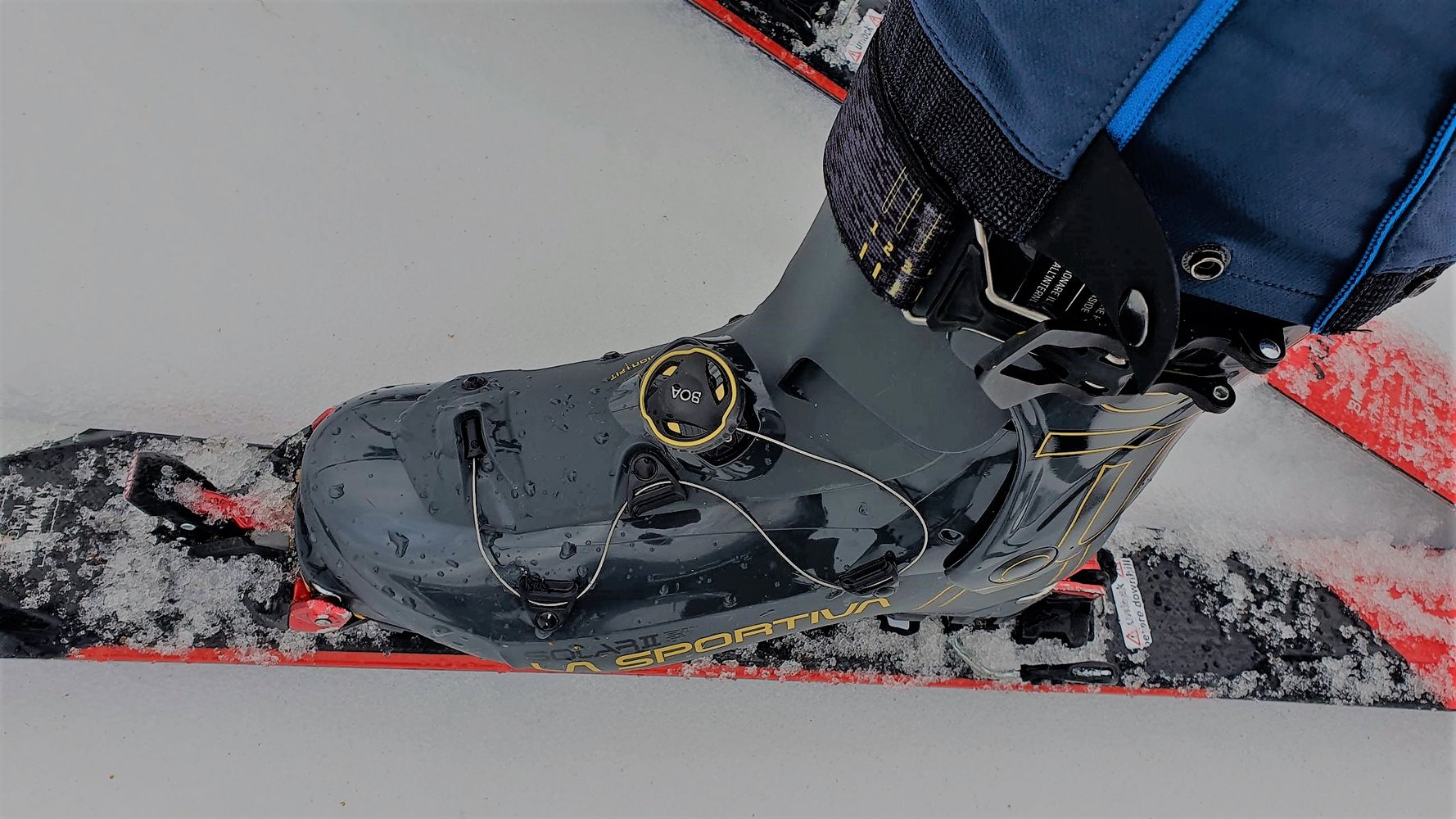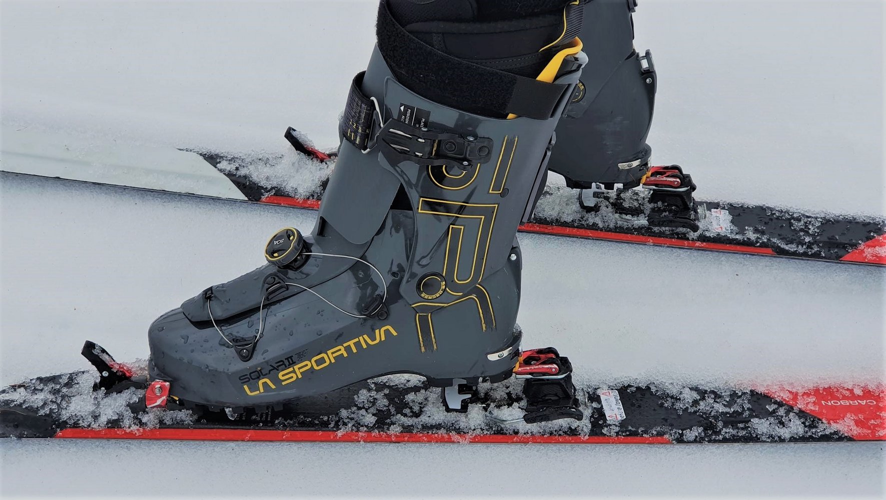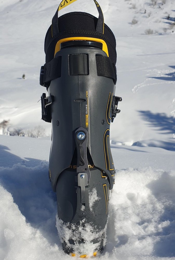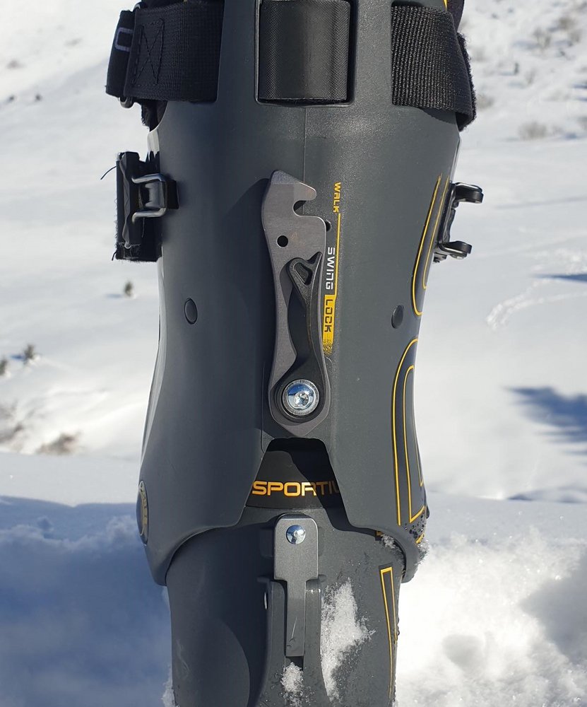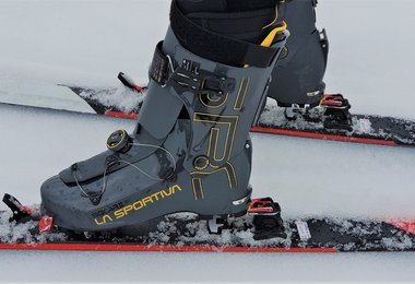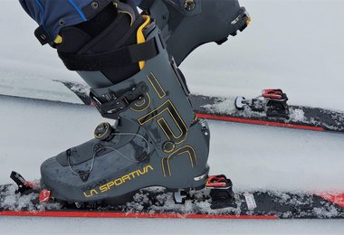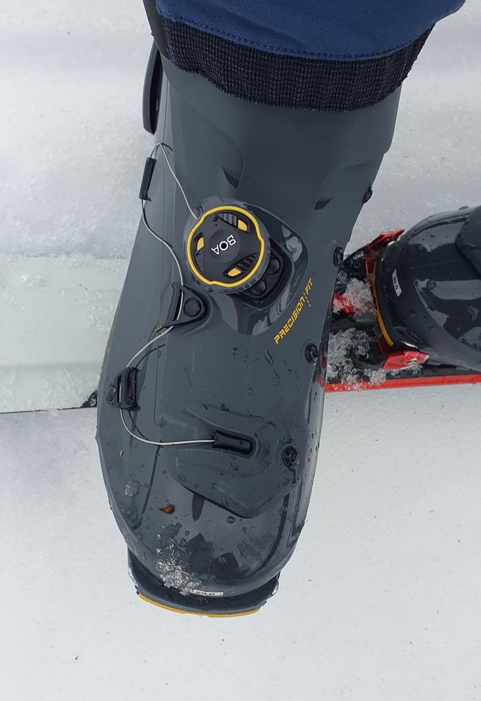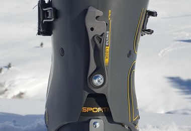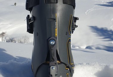 Am Gipfel angekommen, ist der Solar II mit drei Handgriffen abfahrbereit. Zuerst schließt man die obere Schnalle, dann zurrt man den obersten Powerstrap fest, schiebt das patentierte Ski/Walk-System SWING-LOCK nach unten in den Abfahrts-Modus und zieht am Vorfuß den BOA Verschluss zu. Der Solar II erreicht eine sehr hohe Steifheit und eine gute Abfahrtsperformance, da der Schaft auch recht hoch geschnitten ist.