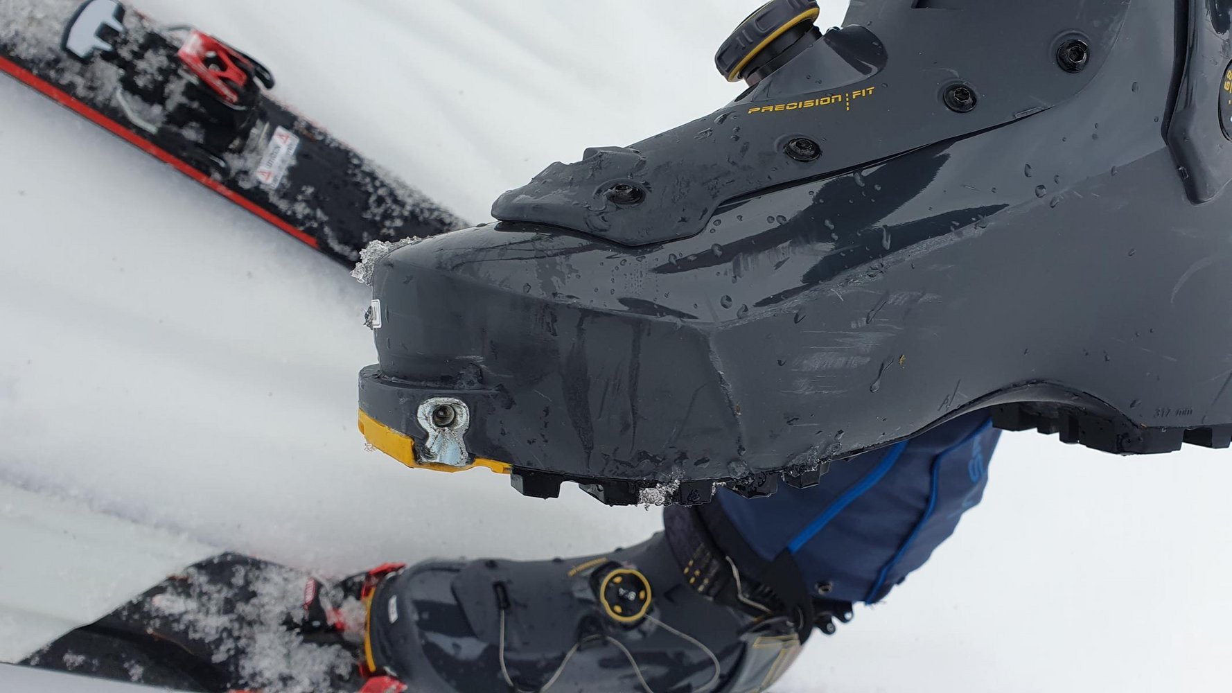 Das ist die positive Überraschung, denn der Solar II ist extrem bequem geschnitten. Im Bereich des Sprunggelenks ist der Solar II im Aufstiegsmodus sehr weit und es gibt hier keine Druckstellen, was insbesondere für Leute mit breiteneee Sprunggelenken sehr interessant ist. Im Vorderfuß-Bereich ist auch ausreichend Platz. Beim Aufstieg verteilt sich der Druck rechts und links des Rists, ist aber nicht besonders groß. Beim Kauf sollte man beachten, dass der Schalensprung (Außenschale) bei jeder ganzen Größe ist. D.h. man hat z.B. bei Größe 29 Spiel nach oben und kann den etwas dickeren Innenschuh durch Bootfitting gut anpassen. Der wirklich bequeme Schnitt des Solar II erlaubt es, diesen Skitourenschuh eher klein zu kaufen.