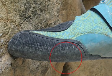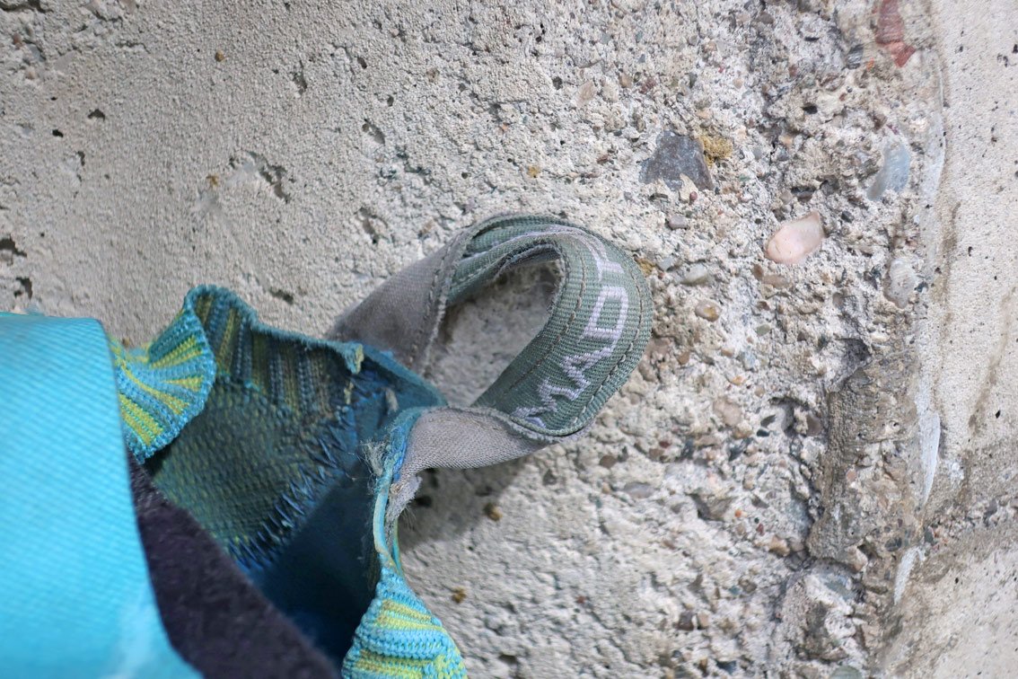 Der Mad Rock Haywire Kletterschuh ist eine Klasse für sich – vor allem was die Passform betrifft. Die Stoffsocke umfasst den ganzen Fuß und die Ferse sitzt bei diesem Schuh mehr als perfekt. Hinten hat er eine große Anziehschlaufe, welche wirklich super zu bedienen ist, man greift sich das große Teil und flux ist der Schuh über die Ferse gestülpt.