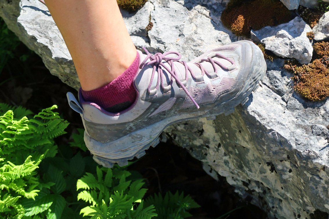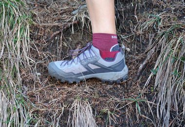 Der Schuh hat eine Gore-Mebran, was aber bei Halbschuhen nur bedingt vor Feuchtigkeit im nassen Gras schützt, man ist aber in der Regel vor allem im Zehenbereich nicht so schnell nass wie ohne Gore-Einsatz. Durch die niedere und weite Öffnung am Knöchel, die man aber gut mit den Schuhbändern fixieren kann – und des luftigen, aber stabilen Außenmaterial schwitzt man nicht wirklich stark (wenn Gore-Tex nicht drauf stehen würde, hätte man es vermutlich nicht bemerkt).