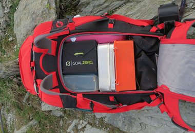 Neben dem geräumigen Hauptfach bieten die Rucksäcke eine große, aber recht flache Fronttasche. Der Hersteller empfiehlt diese Tasche beispielsweise für das Verstauen von Steigeisen. Das können wir nicht ganz nachvollziehen, denn diese würden merklich ins Hauptfach drücken und dessen Volumen beeinträchtigen. Ideal ist die Fronttasche allerdings für leichte, flache Gegenstände wie Wechselshirts. Der Deckel beinhaltet zwei Taschen, wobei die obere Tasche auffallend viel Platz bietet. Hier hat das GPS-Gerät guten Empfang und das Fernglas ist schnell griffbereit. Im Hauptfach gibt es im Rückenbereich noch eine Tasche für das Trinksystem und ein kleines Fach für Wertgegenstände und anderen Kleinkram. Leider ist der Schlauchdurchlass so eng, dass sich das absperrbare Ventil unseres Trinksystems (Camelbak) nur mit viel Mühe durchschieben lässt. Konsequenz: Wir führen den Schlauch durch die Hauptöffnung aus dem Rucksack.