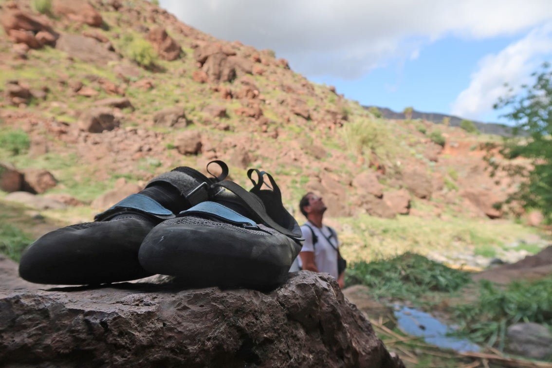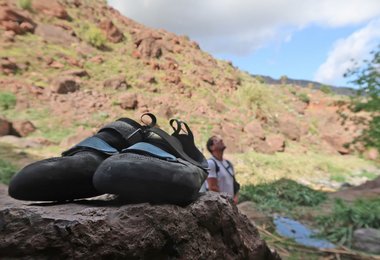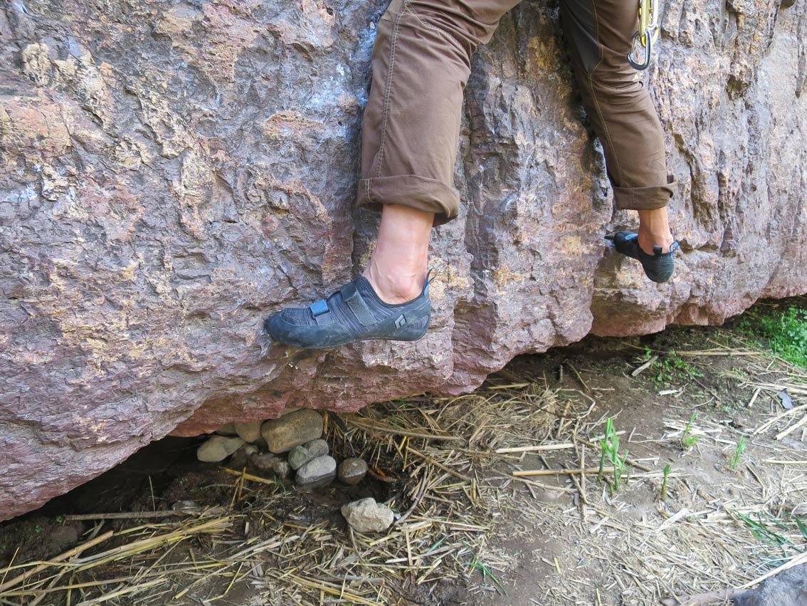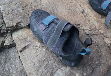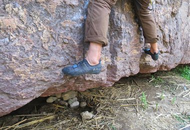 Ich bin bis dato eher weiche Kletterschuhe gewohnt, kletterte viel mit dem Boreal Joker. Dem gegenüber ist der Momentum – der keine Vorspannung besitzt und somit für den ambitionierten Genusskletterer zu empfehlen ist – einen Tick härter. Genau diese Härte ist aber auch das Plus, da man auf kleine Tritte etwas besser steht. Von der Reibung kann man nichts negatives berichten, im Gegenteil, auf schlutzigen Tritten fühle ich mich mit dem Momentum sogar etwas wohler. Mit den zwei gegengleichen Klettverschlüssen lässt sich der Schuh auch schön eng zumachen und man steht eng aber dennoch angenehm im Schuh.