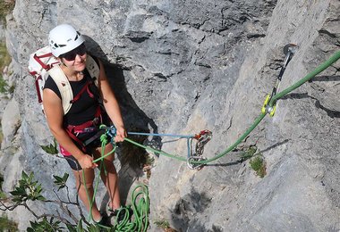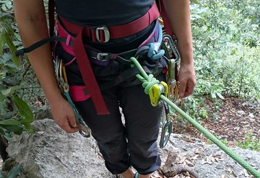 Bei Kletterrouten in Arco gibt es oft auch gemischte Absicherung – also z.B. einen Normalhaken oder eine Sanduhr nach dem Stand und dann erst ein Bohrhaken. Dann hängt man in die Sanduhr zuerst eine normale Expressschlinge und in den darauf folgenden Bohrhaken erst das Edelrid Ohmega ein.