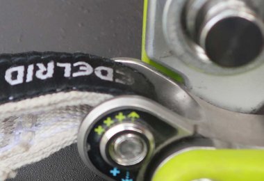 Bei so vielen Vorteilen darf auch eine kleine Schwäche erwähnt werden. Bei sehr dicken und älteren Seilen – das Ohmega ist für Seildurchmesser von 8,6 bis 10,5 zertifiziert – reibt das Seil etwas an der HMPE -Schlinge. Der Abrieb ist aber gering (unser Ohmega war schon oft bei Mehrseillängentouren und in der Halle mit dabei – leichter Abrieb nur am E von Edelrid erkennbar; siehe Bild). Die Schlinge ist aber laut Edelrid aus einem sehr strapazierfähigen, abriebfesten Gewebe konstruiert. Die kleine Schlinge, mit der man die drei Blockierstufen einstellen kann, lässt sich auch austauschen (wie das bei Edelrid gehandhabt wird, ist noch nicht ganz klar).