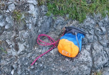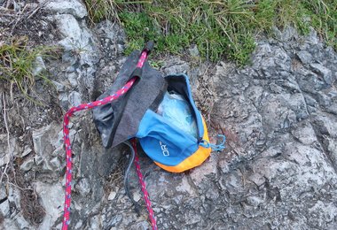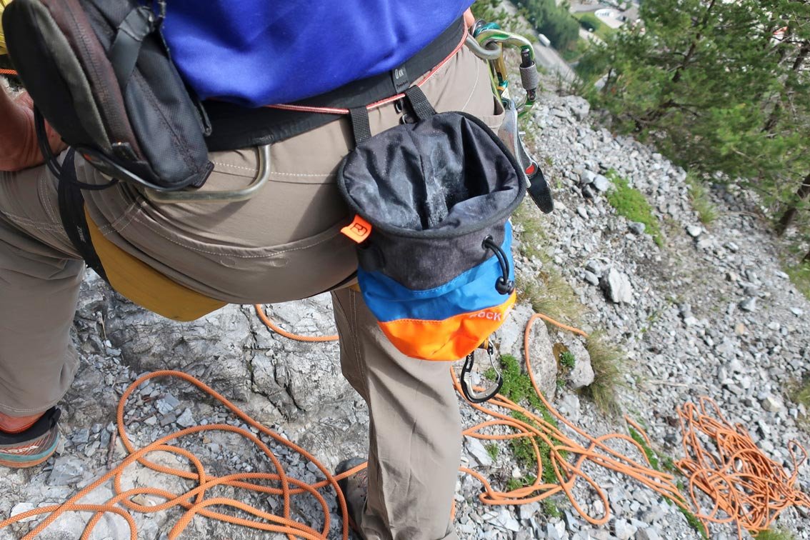 Das Eintauchen der Finger in den Chalkbag ist angenehm. Wir haben uns den Rock Doc mit einer dünnen Reepschnur umgebunden – die Reepschnur kann man im Notfall auch nützlich einsetzen (z.B. als Rückzugsschlinge oben lassen). Der Chalkbag lässt sich gut verschließen und mit der umgewickelten Reepschnur hatten wir bis dato nie weißes Pulver im Rucksack. Evtl. die Farbe – Blau und grelles Leuchtorange - sieht schon stark nach Medibag aus, die Optik könnte man evtl. in Zukunft noch etwas peppiger gestalten ;-)