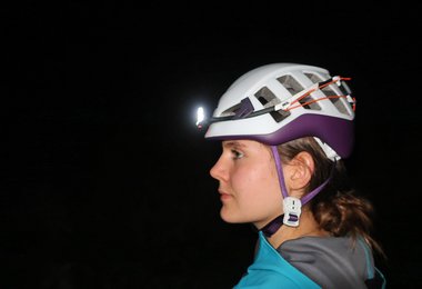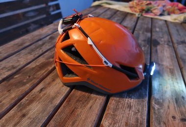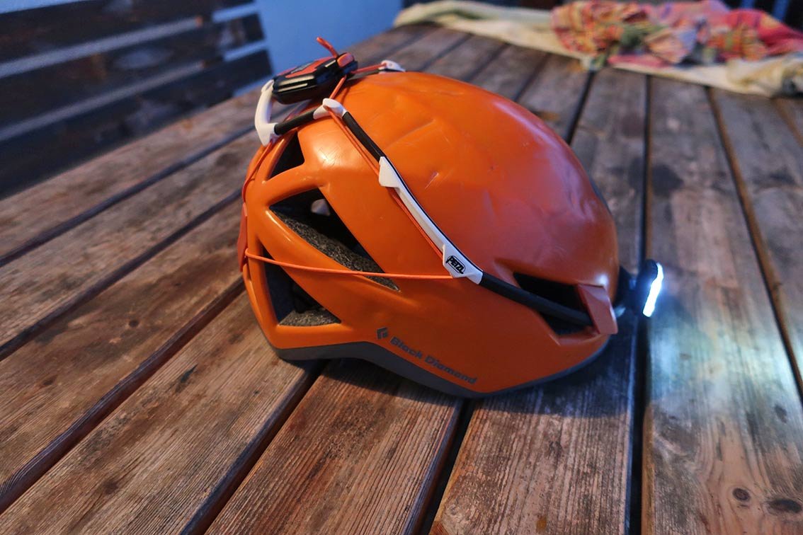 Petzl Iko Core und der Helm – das ist so eine Geschichte für sich. Da wir uns nicht wirklich mit der Gebrauchsanweisung beschäftigt haben, hatten wir einige Probleme, die Core in der Dunkelheit auf unseren M/L Black Diamond Kletterhelm zu montieren. Die Iko Core passt perfekt auf Petzl Helme aller Größen und auch gut auf kleine Kletterhelme (mit unserem Black Diamond S/M Helm gab es überhaupt kein Problem). Bei größeren Kletterhelmen oder futuristischen Helmformen muss man die Iko Core mit dem orangen Gummi hinten in der Lampenaufnahme am Helm fixieren – aber da sind wir leider erst etwas später drauf gekommen. Für Helme, auf die die Iko Core partout nicht drauf passen will, gibt es von Petzl den "Uni Adapt" Klebeclip (das ist quasi eine Stirnlampenhalterung zum Aufkleben auf den Helm).