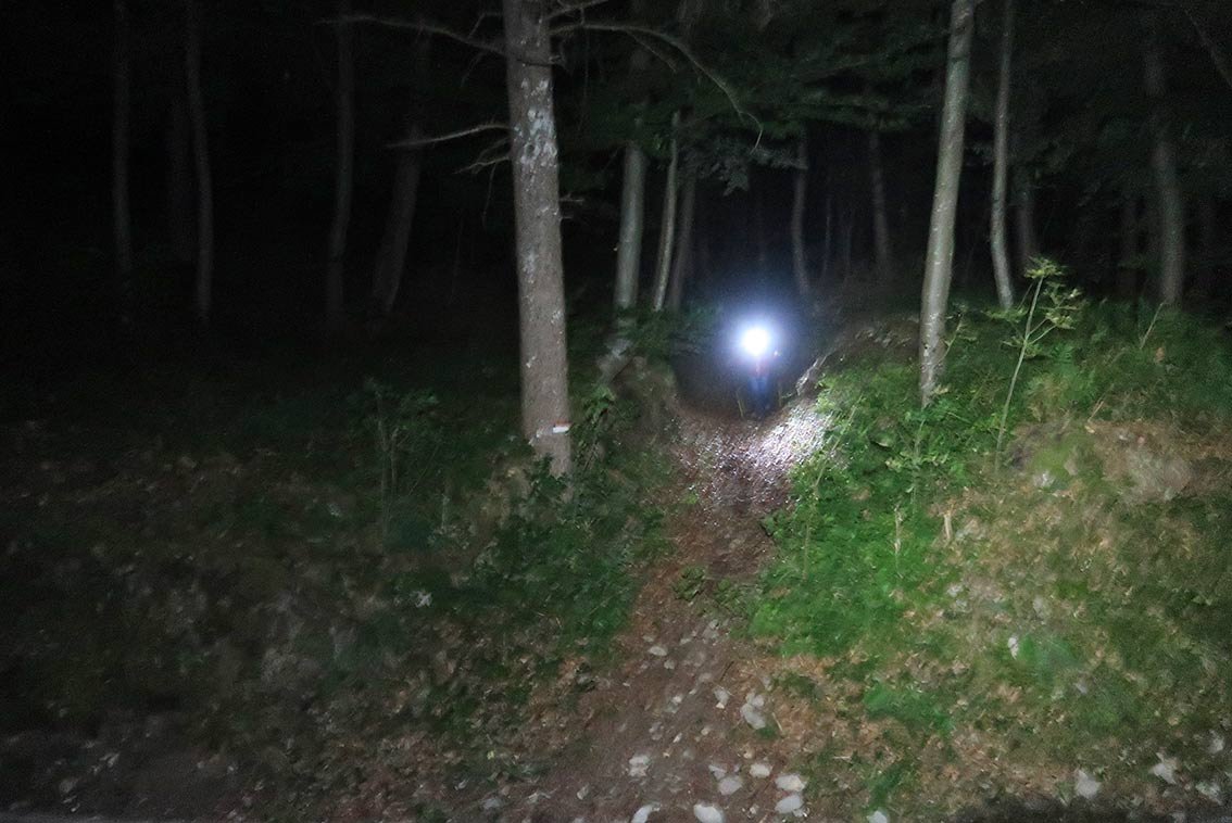 Die Iko Core leuchtet mit unterschiedlichen Lichtkegeln gleichzeitig, so muss man nicht mehr zwischen Fernlicht und Gehlicht umstellen. Bei langsamen Gehen reicht die Standard-Stufe mit 100 Lumen mehr als aus, wenn man aber nach der Tour flotter mit dem MTB auf nicht so gutem Untergrund ins Tal fährt, schaltet man besser auf Max power und nützt die vollen 500 Lumen der Lampe aus. Die Ausleuchtung des Geländes ist in beiden Stufen sehr gut!