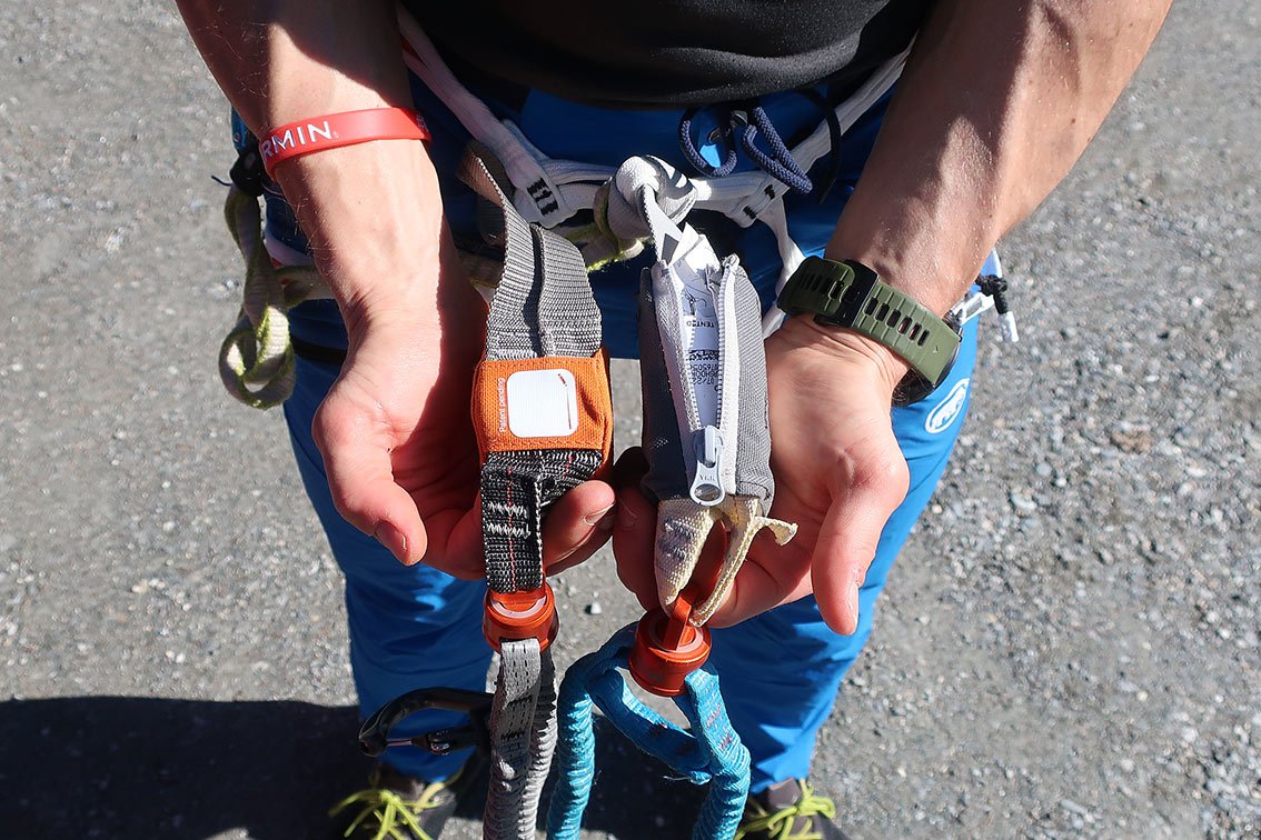 Rastschlinge - kein anderes Set hat diese auf so hohem Niveau. Klein, aber doch sehr funktionell ausgeführt und Petzl spendiert als einziger Hersteller sogar eine serienmäßige Gummifixierung für den Karabiner. Rastkarabiner - der Petzl Ange L ist da ein gewaltiger Tipp (danke dafür an den österreichischen Petzl-Vertrieb). Der superleichte Ange L, lässt sich bei Nichtgebrauch ideal in den elastischen Flexarm integrieren und baumelt so nicht störend hin und her.