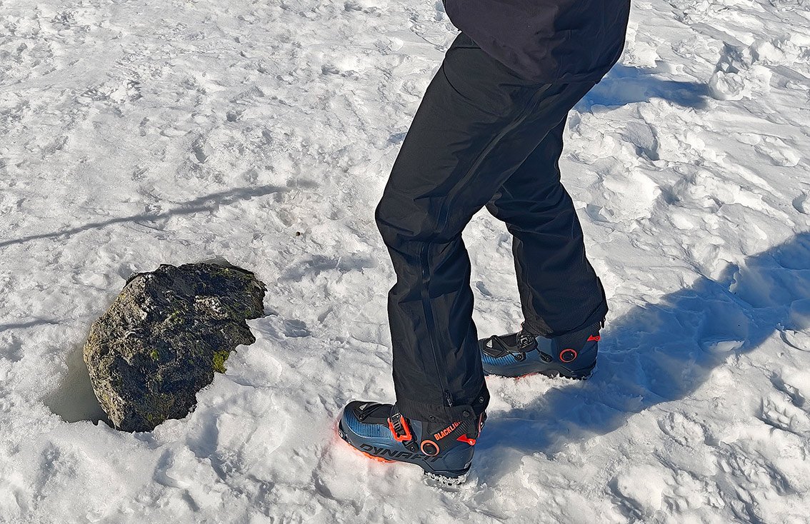 Die Latok GTX Pant Überhose passt im Grunde genau zur Jacke und ist auf demselben hohen technischen Niveau. Der Zipp ist durchgehend - soll heißen, man kann beim Anziehen der Latok GTX Pant getrost die Steigeisen oder Tourenskier an den Füßen lassen. Oben kann man die Bundverstellung mit einem Klettteil (mit dem man den Bund der Latok GTX Pant auch enger machen kann) beidseitig über jeden Zipp legen. So kann man den Zipp bei Skitouren im Aufstieg nach unten hin geöffnet lassen und bekommt etwas mehr Luft an die Oberschenkel beim Gehen. Es besteht sogar die Möglichkeit, bei Bedarf einen Gürtel einzuziehen, die Gürtelschlaufen sind vorhanden.